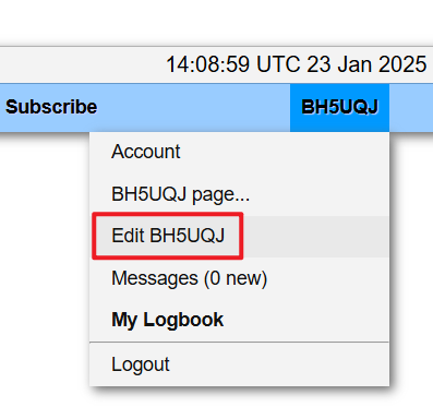 进入 QRZ.com,将鼠标悬浮在右上角的呼号,可看到一个弹出菜单,点击 Edit XXXXXX ,进入编辑页面。