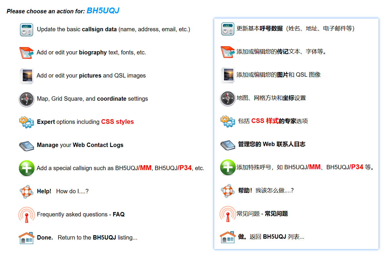- Update the basic callsign data (name, address, email, etc.):更新基本呼号数据(姓名、地址、电子邮件等),这里会保留激活呼号表单中填写过的信息。