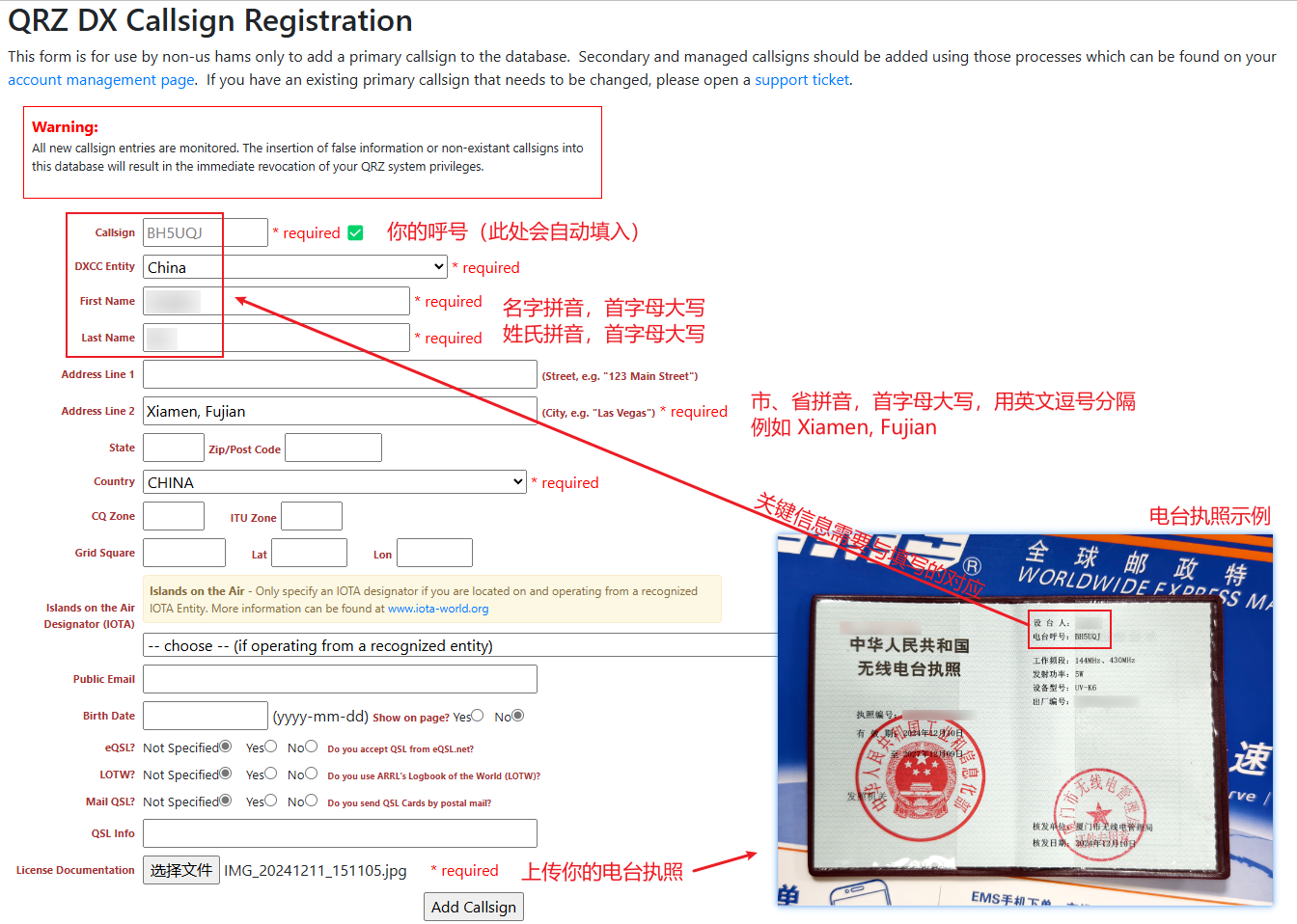 - 在 qrz.com 验证执照时,如果担心个人隐私泄露,可将个人身份证号码信息抹去后再上传。其他网站同理。